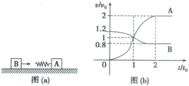 6. (2025·湖南省高三二模)(多选)如图(a),一质量为m的物块A与轻质弹簧连接,静止在光滑水平面上,物块B向A运动,t=0时与弹簧接触,到t=2t₀时A与弹簧分离,A、B的v-t图像如图(b)所示。已知从t=0到t=t₀时间内,物块A运动的距离为0.36v₀t₀。下列说法正确的是(