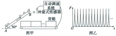 9. (2025·广西卷)图甲为某智能分装系统工作原理示意图,每个散货经倾斜传送带由底端A运动到顶端B后水平抛出,撞击冲量式传感器使其输出一个脉冲信号,随后竖直掉入已与水平传送带共速度的货箱中,此系统利用传感器探测散货的质量,自动调节水平传送带的速度,实现按规格分装。倾斜传送带与水平地面夹角为30°,以速度v₀匀速运行。若以相同的时间间隔Δt将散货以几乎为0的速度放置在倾斜传送带底端A,从放置某个散货时开始计数,当放置第10个散货时,第1个散货恰好被水平抛出。散货与倾斜传送带间的动摩擦因数μ=√3/2,到达顶端前已与传送带共速。设散货与传感器撞击时间极短,撞击后竖直方向速度不变,水平速度变为0。每个长度为d的货箱装总质量为M的一批散货。若货箱之间无间隔,重力加速度为g。分装系统稳定运行后,连续装货,某段时间传感器输出的每个脉冲信号与横轴所围面积为I如图乙,求这段时间内: