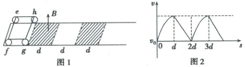 6. (2025·重庆卷)(多选)如图1所示,小明设计的一种玩具小车由边长为d的正方形金属框efgh做成,小车沿平直绝缘轨道向右运动,轨道内交替分布有边长均为d的正方形匀强磁场和无磁场区域,磁场区域的磁感应强度大小为B,方向竖直向上。gh段在磁场区域运动时,受到水平向右的拉力F = kv + b(k > 0,b > 0),且gh两端的电压随时间均匀增加;当gh在无磁场区域运动时,F = 0。gh段速度大小v与运动路程s的关系如图2所示,图中v0(v0 < $\frac{b}{k}$)为gh每次经过磁场区域左边界时速度大小,忽略摩擦力。则( )