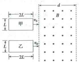 5. (2025·晋、陕、宁、青卷)如图,光滑水平面上存在竖直向上、宽度d大于2L的匀强磁场,其磁感应强度大小为B。甲、乙两个合金导线框的质量均为m,长均为2L,宽均为L,电阻分别为R和2R。两线框在光滑水平面上以相同初速度v0 = $\frac{4B^{2}L^{3}}{mR}$并排进入磁场,忽略两线框之间的相互作用。则(