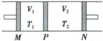 7. (2025·河南卷)(多选)如图,一圆柱形汽缸水平固置,其内部被活塞$M$、$P$、$N$密封成两部分,活塞$P$与汽缸壁均绝热且两者间无摩擦。平衡时,$P$左、右两侧理想气体的温度分别为$T_1$和$T_2$,体积分别为$V_1$和$V_2$,$T_1 \lt T_2$,$V_1 \lt V_2$。则(