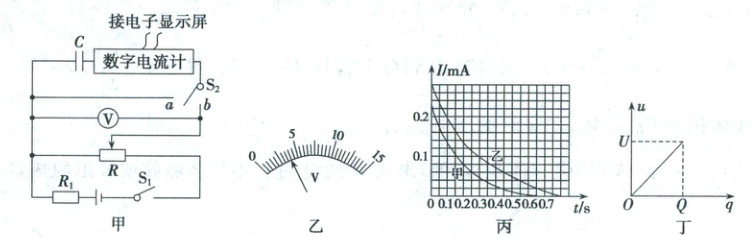 u和相应的电容器所带的电荷量q,得到的u−q图像如图丁所示,则当两极板间电压为U时电容器所
