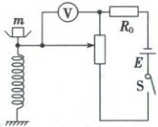 (2) 电路总电阻$R_{总}=R_{0}+R+r$,电流$I=\frac{E}{R_{0}+R+r}$。滑片下移距离$x=\frac{mg}{k}$,滑动变阻器接入电压表示数部分的电阻$R_{x}=\frac{R}{L}x=\frac{Rmg}{kL}$。电压表示数$U=IR_{x}=\frac{ERmg}{kL(R_{0}+R+r)}$,整理得$m=\frac{kL(R_{0}+R+r)U}{ERg}$。因$m$与$U$成正比,刻度均匀。