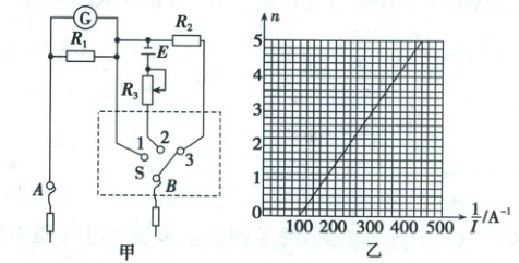 接入$n$个电阻时,总外电阻$R_{外}=100nΩ$,由闭合电路欧姆定律$E=I(R_{内}+100n)$,变形得$n=\frac{E}{100}·\frac{1}{I}-\frac{R_{内}}{100}$。