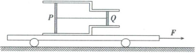 14. (10分)(2025·河北省沧州市高三二模)如图所示,半径不同的两个导热性能良好的圆筒连接组成的汽缸放置在小车上,小车静置在光滑水平面上。不可伸长的轻杆连接的两活塞P、Q之间封闭着一定质量的理想气体,整个系统处于静止状态。给小车施加水平向右的恒定拉力F,经过一段时间活塞相对汽缸重新静止,在此过程中汽缸始终相对小车静止。已知汽缸和小车质量均为M,两活塞总质量为m,P、Q的横截面积分别为2S和S,初始时封闭气体体积为V,大气压强为p₀,环境温度不变,两圆筒足够长,不计活塞和汽缸之间的摩擦力,封闭气体质量远小于活塞质量,空气阻力远小于拉力F。求: