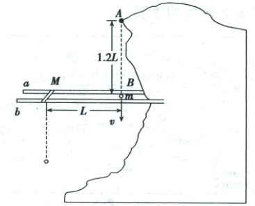 15. (16分)某地为发展旅游经济,因地制宜利用山体举办了机器人杂技表演。表演中,需要将质量为$m$的机器人抛至悬崖上的$A$点,图为山体截面与表演装置示意图。$a$、$b$为同一水平面上两条光滑平行轨道,轨道中有质量为$M$的滑杆。滑杆用长度为$L$的轻绳与机器人相连。初始时刻,轻绳绷紧且与轨道平行,机器人从$B$点以初速度$v$竖直向下运动,$B$点位于轨道平面上,且在$A$点正下方,$AB=1.2L$。滑杆始终与轨道垂直,机器人可视为质点且始终做同一竖直平面内运动,不计空气阻力,轻绳不可伸长,$\sin37^{\circ}=0.6$,重力加速度大小为$g$。