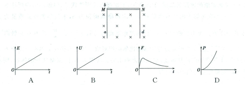 11. (2025·山东省济南市高三二模)如图所示,竖直平面内有一“$\sqcap$”形金属线框$abcd$,边框$ab$和$cd$足够长,整个装置处于与线框平面垂直的匀强磁场中。与边框$bc$长度相等的金属棒$MN$从非常靠近$bc$的位置由静止释放,同时对金属棒施加一竖直方向的外力$F$,使金属棒以重力加速度$g$向下做匀加速直线运动,运动过程中,金属棒始终保持水平,并与金属边框接触良好。金属边框、金属棒均由相同材料、相同粗细的金属导线制成,以金属棒刚开始释放的时刻为$t = 0$时刻,金属棒切割磁感线产生的电动势为$E$,金属边框$bc$两端的电压为$U$,金属棒的电热功率为$P$,忽略自感效应。下列图像中对应物理量与时间$t$的变化关系图像可能正确的是(