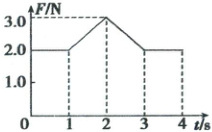 10.BCD A.根据题意,由图可知,在第$1s$内拉力$F = 2.0N = mg$,可知,物体保持静止状态,故A错误;BC.根据题意,由$F - t$图像面积表示拉力的冲量,结合图像可得,$0 \sim 2s$内,拉力的冲量为$I_1 = 2 × 1N · s + \frac{1}{2} × (2 + 3) × 1N · s = 4.5N · s$,$3s$内,拉力的冲量为$I_2 = 2 × 1N · s + 2 × \frac{1}{2} × (2 + 3) × 1N · s = 7N · s$,设第$2s$末的速度为$v_2$,第$3s$末速度为$v_3$,由动量定理有$I_1 - mgt_2 = mv_2$,$I_2 - mgt_3 = mv_3$,解得$v_2 = 2.5m/s$,$v_3 = 5m/s$,则拉力$F$在第$3s$末的功率为$P = F_3v_3 = 2 × 5W = 10W$,故BC正确;D.结合上述分析可知,$0 \sim 1s$内物体静止,$1 \sim 3s$内物体做加速运动,设物体此时间内上升的高度为$h_1$,由动能定理有$\frac{F_1 + F_2}{2}h_1 - mgh_1 = \frac{1}{2}mv_3^2 - 0$,解得$h_1 = 5m$,$3 \sim 4s$物体以$v_3$做匀速直线运动,上升的高度为$h_2 = v_3 \Delta t = 5 × 1m = 5m$,则物体在前$4s$内的平均速度大小为$\overline{v} = \frac{h_1 + h_2}{t} = \frac{5 + 5}{4}m/s = 2.5m/s$,故D正确。
