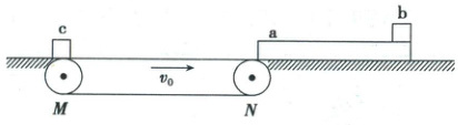 16. (16分)(2025·贵州省贵阳市高三三模)如图,$MN$为一长为$L = 20m$的水平传送带,传送带右端平滑对接一足够长的水平地面,在水平地面上紧靠传送带右端静置一质量为$m_1 = 3kg$、长为$d$的木板$a$,$a$的最右端放置一质量为$m_2 = 1.5kg$的物块$b$。当传送带以恒定的速率$v_0 = 8m/s$顺时针转动时,在传送带的左端由静止释放一质量为$m_3 = 1kg$的物块$c$。已知$a$与水平地面间的动摩擦因数$\mu_1 = \frac{1}{3}$,$b$与$a$上表面之间、$c$与传送带之间的动摩擦因数均为$\mu_2 = 0.2$,不计$c$与水平地面间的摩擦,$b$、$c$均可视为质点。设$c$与$a$的每次碰撞均为弹性正碰,且碰撞时间极短,取重力加速度大小$g = 10m/s^2$,求: