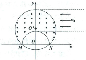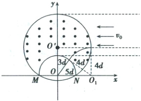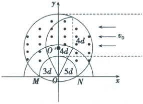 11. (2025·湖南省长沙市长郡中学高三模拟)在平面直角坐标系$xOy$中有如图所示的有界匀强磁场区域,磁场上边界是以$O'(0,4d)$点为圆心、半径为$R=5d$的一段圆弧,圆弧与$x$轴交于$M(-3d,0)$、$N(3d,0)$两点,磁场下边界是以坐标原点$O$为圆心,半径为$r=3d$的一段圆弧。如图,在虚线区域内($3d<y<9d$)有一束均匀分布带负电的粒子沿$x$轴负方向以速度$v_{0}$射人该磁场区域。已知磁场方向垂直纸面向外,磁感应强度大小为$B=\frac{mv_{0}}{4dq}$,带电粒子质量为$m$,电荷量大小为$q$,不计粒子重力,$\sin37^{\circ}=0.6,\cos37^{\circ}=0.8$,下列说法中正确的是(