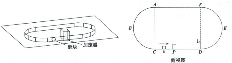 15. (12分)(2025·重庆市育才中学高三三诊)在水平桌面上用竖直挡板围成固定轨道,俯视图如图所示,半圆形轨道$ABC$和$DEF$的半径为$R$,在$P$点处有一个加速器,小滑块每次通过加速器后,速度增大为通过前的$k$倍。一质量为$m$的小滑块$a$(可视为质点)从$C$点处以初速度$v_{0}$沿轨道内侧逆时针运动,经过加速器后与静止于$D$点的、且同$a$完全相同的小滑块$b$(可视为质点)发生弹性碰撞。已知两滑块每次经过$C$点时速度均为$v_{0}$,轨道$ABC$处桌面粗糙,其他摩擦均不计,重力加速度为$g$。求: