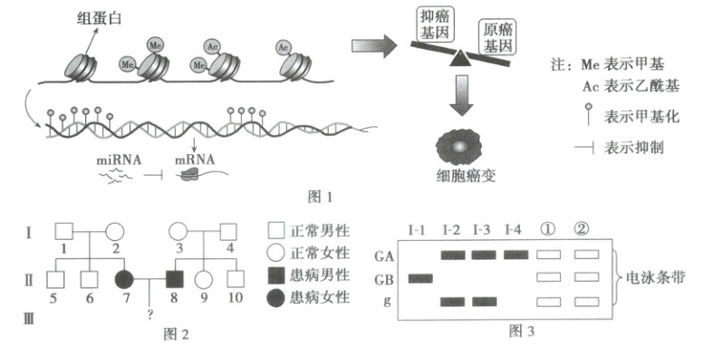 ②进一步研究表明,控制合成 G6PD 的基因却位于 X 染色体上,GA、GB 控制合成 G6PD,而 g 不能控制合成 G6PD,推测Ⅱ-7 患病的原因可能是基因突变的结果,也可能是表观遗传。为探究Ⅱ-7 患病原因,现对患者家族部分成员的 GA、GB、g 进行相关检测,结果为图 3 电泳图谱,若Ⅱ-7 的患病电泳图谱为___,则为基因突变的结果;若Ⅱ-7 的患病电泳图谱为___,则为表观遗传的结果。