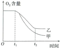 6. (2025·山东日照·三模)现将等量的甲、乙两个品种的小麦种子分别置于两个密闭、容积相同的棕色瓶内,各加入适量且等量的水。25℃条件下瓶内O₂含量变化如图所示。据图分析正确的是(