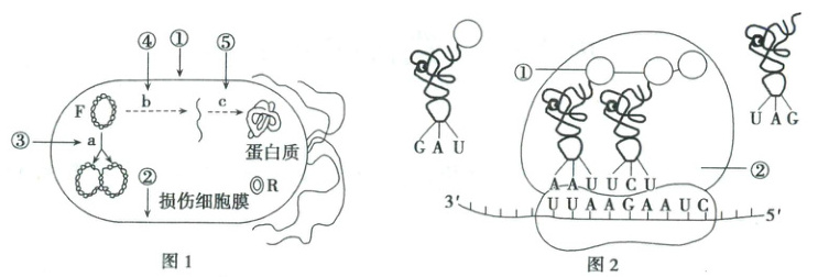 (2)图1中过程b为转录,过程c为翻译,转录的产物有mRNA、tRNA、rRNA。故转录可以为c过程翻译提供的物质有mRNA(作为翻译模板)、tRNA(运转氨基酸)、rRNA(参与核糖体的构成)。翻译的场所是核糖体,抗生素⑤作用于参与过程c的细胞结构,该结构是核糖体。