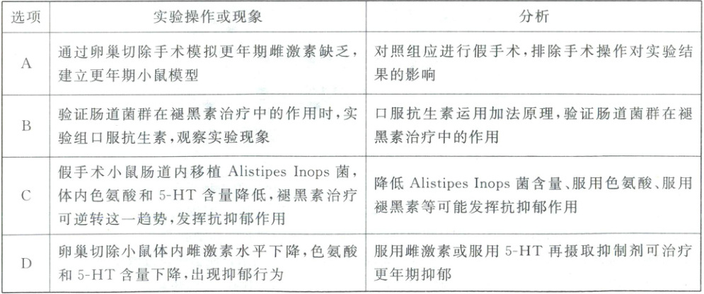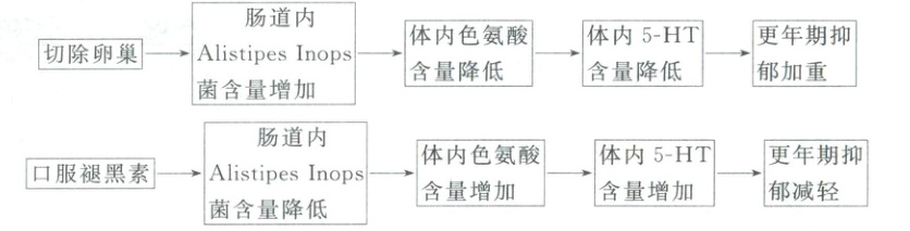 6. B A、雌激素由卵巢产生,切除卵巢可模拟更年期雌激素缺乏,但切除卵巢的手术创伤可能也会影响雌激素含量。 为排除手术操作对实验结果的影响,对照组应进行手术,但不切除卵巢。 A正确;B、验证肠道菌群在褪黑素治疗中的作用时,自变量为肠道菌群的有无,实验组服用抗生素,可抑制肠道菌群,运用的是减法原理,B错误;C、根据实验现象可知,为验证菌量增加的独立致抑郁效应及褪黑素的抗抑郁效果,向假手术小鼠肠道内移植Alistipes Inops菌,体内色氨酸和5-HT含量降低,褪黑素治疗可逆转这一趋势,发挥抗抑郁作用,因此降低Alistipes Inops菌含量。 提高色氨酸和5-HT含量,以及服用褪黑素均可发挥抗抑郁作用,C正确;D、根据实验现象可知,提高雌激素水平、提高色氨酸和5-HT含量可治疗更年期抑郁,5-HT是一种兴奋性神经递质,一经作用就会失活或被回收利用,通过抑制其回收,提高突触间隙中5-HT含量可治疗更年期抑郁。 因此服用雌激素或服用5-HT再摄取抑制剂可治疗更年期抑郁,D正确。 故选B。
