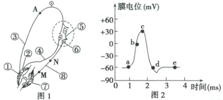 )A.刺激图1中③处,在④处可检测到电位变化,该过程属于反射