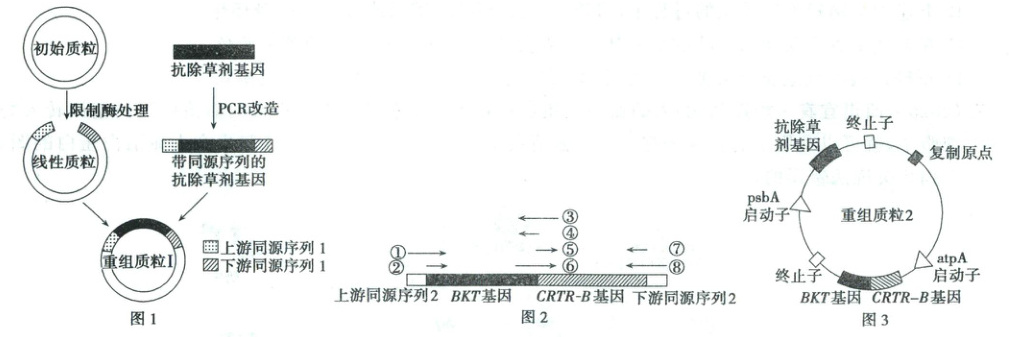 (2)①根据PCR扩增的原理,在PCR过程中,为确保基因两端具有所需同源序列,需在5'端添加对应的同源序列;根据题意,若要确保抗除草剂基因能够从重组质粒中切除,则所需引物(5'→3')的序列应为“同源序列+限制酶识别序列+特异性扩增引物序列(抗除草剂基因部分序列)”,AC错误,B正确。故选B。②根据图2所示,要通过“无缝克隆法”同时将BKT基因和CRTR-B基因插入质粒,则要保证BKT基因一侧有一致同源序列,另一侧能带上CRTR-B基因,因此扩增BKT基因所用的引物为①③;同理,扩增CRTR-B基因所用的引物为⑥⑧。③启动子是转录的起始信号,选用内源性启动子的目的是防止基因沉默,确保目的基因能表达。