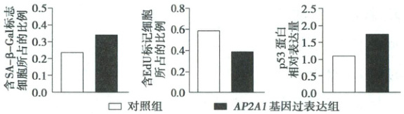 13. 科研人员以SA-β-Gal作为细胞衰老的分子标志,以EdU作为细胞DNA复制的标记,揭示了AP2A1蛋白通过调节p53蛋白表达量来影响细胞衰老的机制,实验结果如下图。下列叙述错误的是(