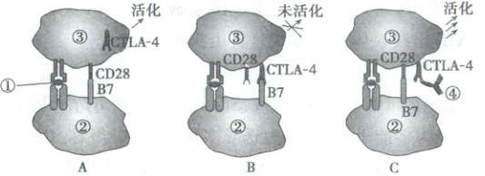 7.C 图A中,在细胞免疫的起始阶段,细胞②将①传递给细胞③,使其活化,则细胞③是T细胞,①是抗原,②是吞噬细胞,A正确;结合图B和图C可知,细胞③的活化除了需要细胞②将①传递给细胞③外,还有B7与CD28的结合,B正确;细胞免疫启动后,CTLA - 4开始在细胞③表面表达,由于细胞②表面受体分子B7与CTLA - 4的亲和力大于与CD28的亲和力,导致细胞②表面受体分子B7与CD28不能结合,使细胞③活化被抑制,C错误;针对CTLA - 4的单克隆抗体与细胞③表面的CTLA - 4特异性结合,使CD28与细胞②表面的B7恢复结合,细胞③活化的抑制作用解除,能够增殖分化从而有效清除肿瘤细胞,D正确。