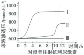 B.中枢性尿崩症患者的尿液渗透压变化可用曲线Ⅱ表示,注射抗利尿激素后尿液渗透压升高