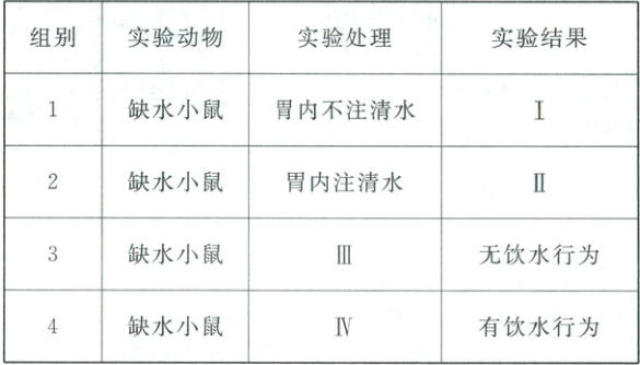 (3)①四组均为缺水小鼠,第1组小鼠胃内不注清水,小鼠会口渴,故第1组实验结果为小鼠有饮水行为;第2组小鼠胃内注清水,会将兴奋传至SFO,关闭口渴信号,故第2组实验结果为小鼠无饮水行为。②要验证胃肠道渗透压信号对SFO神经元的抑制是解除口渴的必要条件,同样在激活SFO神经元的情况下,如果向胃内注清水胃肠道渗透压降低,胃肠道产生的兴奋会引起SFO关闭口渴信号,没有饮水行为,故Ⅲ应为:激活SFO神经元+胃内注清水;如果不向胃内注清水胃肠道渗透压没有降低,不能解除口渴,缺水小鼠会出现饮水行为,故Ⅳ为:激活SFO神经元+胃内不注清水,故第3组实验处理应为C,第4组实验处理应为D。