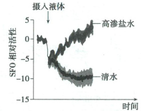 (2)饮水时,口咽部感受器产生的兴奋,会沿着神经纤维传至SFO,关闭“口渴”信号,减少饮水。根据实验数据可知,摄入高渗盐水和清水都会引起SFO相对活性下降,但饮用高渗盐水组,SFO相对活性很快又会升高,又会产生口渴的信号,故饮用清水可以解除口渴,但摄入高渗盐水只能短暂解除口渴。