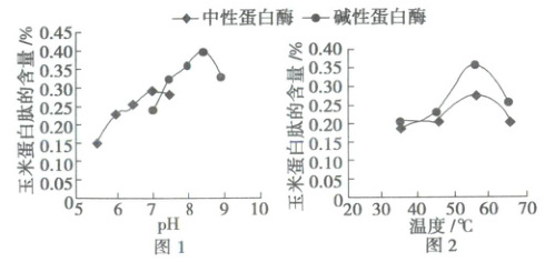 3. 玉米在加工成各种产品的过程中,产生的下脚料中含有玉米蛋白,直接丢弃不仅浪费资源,还污染环境。某科研小组为提高玉米蛋白的利用率,利用中性蛋白酶和碱性蛋白酶对玉米蛋白进行水解,并将其加工成玉米蛋白肽。如图 1、2 表示两种蛋白酶在不同条件下水解玉米蛋白的实验结果。下列有关叙述错误的是(