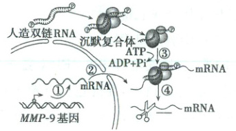 12. MMP-9 是一种明胶酶,能促进肿瘤细胞的浸润、转移。科研人员通过人工合成与 MMP-9 基因互补的双链 RNA,利用脂质体转入低分化胃癌细胞中,干扰细胞中 MMP-9 基因的表达,从而达到一定的疗效,部分图示如下。请据图回答下列问题: