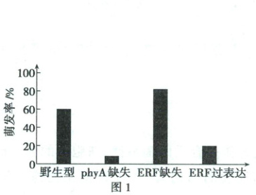 (2)光敏色素A(phyA)接受适合光照后,会转变为激活状态。科研人员利用phyA激活剂分别处理野生型、phyA缺失突变体、ERF(一种胞内蛋白)缺失突变体及ERF过表达突变体的种子,并检测其萌发率,如图1。由结果可以推测,phyA激活的条件下ERF蛋白能够