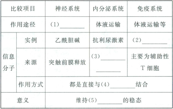 11. 机体的调节系统主要有三个,即神经系统、内分泌系统和免疫系统,三者具有共同的“语言”——信息分子。这三大调节系统互相联系,形成完整的调节网络。请参照表中内容完成下表: