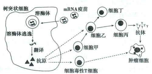 (2)据图分析,溶酶体中含有多种水解酶,如果 mRNA 被溶酶体中的水解酶降解,就无法发挥编码肿瘤抗原的作用。“溶酶体逃逸”可以使 mRNA 避免被溶酶体中的水解酶降解,从而能够正常翻译出肿瘤抗原。