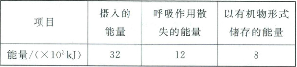 (3)据表分析,该食虫鸟种群同化的能量为$12×10^{2}+8×10^{3}=20×10^{3}(kJ)$,未被同化的能量$=32×10^{3}-20×10^{3}=12×10^{3}(kJ)$,未被同化的能量占摄入能量的$12×10^{3}÷(32×10^{3})=37.5\%$;以有机物形式储存的能量主要去向有流向分解者和流向下一营养级和未被利用。