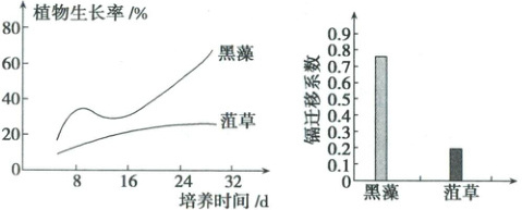 (3)为筛选适合引入镉污染水体的沉水植物,研究者从镉污染水体中取底泥、水,用来培养本地沉水植物黑藻和菹草。测定两种植物的生长率和镉迁移系数(镉迁移系数可反映植物由根系向地上部分迁移镉的能力),结果如下图。