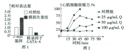 (3)本实验的目的是研究模拟失重条件下槲皮素(Q)对心肌细胞收缩力的保护作用,实验的自变量是槲皮素的浓度,因变量是心肌细胞的收缩力,据图2可知,与对照组相比,实验组的心肌细胞收缩力均有所增加,说明槲皮素对心肌细胞收缩有保护作用,且在一定范围内,随槲皮素浓度的增加,该保护作用增强。