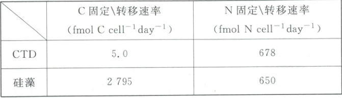(3)为深入研究CTD和硅藻之间的代谢相互作用关系,研究人员测量了硅藻和CTD的$C\N$固定和转移率,结果见表。结合图2,说明CTD