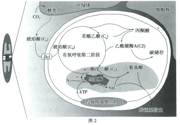 (2)据图2可知,硅藻的光合产物运出叶绿体后,在硅藻细胞质基质中转化成琥珀酸,经Dcl进入CTD细胞质基质中,参与其细胞代谢;CTD吸收N₂后经一系列过程转化为NH₃和氨基酸提供给硅藻。