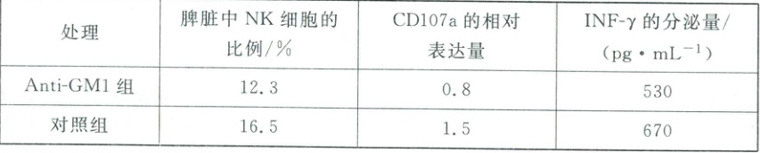 3. (2025·河北沧州·三模)自然杀伤细胞(NK细胞)分泌的干扰素-γ(INF-γ)能杀伤肿瘤细胞,CD107a的表达与NK细胞的活化显著相关。抗GM1抗体(Anti-GM1)与一些免疫疾病有关,研究人员探究了静脉注射Anti-GM1对小鼠NK细胞的影响,部分结果如表所示。下列分析正确的是(