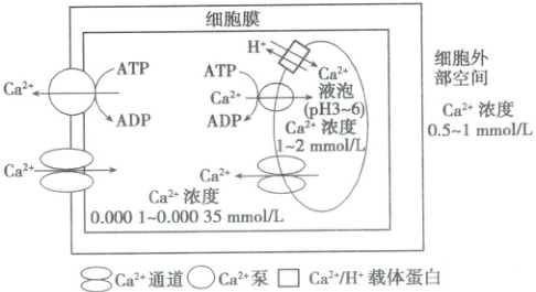 注:$Ca^{2+}/H^{+}$载体蛋白将$H^{+}$顺着电化学势能梯度转出液泡膜的同时,将$Ca^{2+}$转入液泡内。
