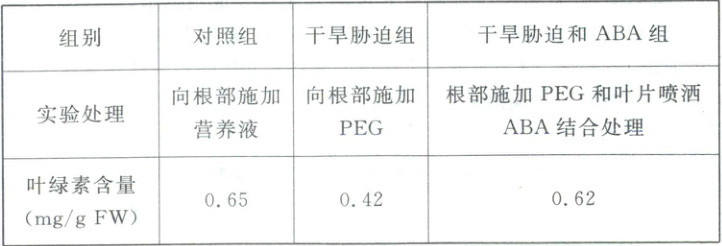 7. (2025·江苏南通·模拟预测)为研究外源脱落酸(ABA)对干旱胁迫下小麦的影响,科研人员将小麦分别进行处理,一段时间后检测叶片中叶绿素的含量,结果如下表。下列叙述错误的是