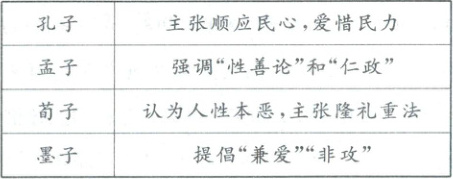 1.A 孔子主张顺应民心、爱惜民力,孟子强调“仁政”,荀子隆礼重法以规范民众,墨子“兼爱”“非攻”也着眼于子民,这些都体现出从不同角度构建民本思想内涵,故选 A 项;材料中各家主张虽有差异,但并非对立,如孟子与荀子对人性的观点看似相反,实则均以规范治理为目标,排除 B 项;社会转型思想需涉及经济、政治结构变革,而材料仅聚焦治国理念,未体现社会转型复杂性,排除 C 项;德法并用仅荀子明确提出,孔孟侧重德治,墨子强调兼爱,无法概括整体,排除 D 项。