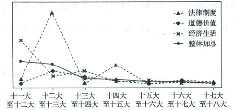 10. (2025·山西临汾三模·9)改革实践的决策者、参与者自身往往会经历一个跳跃式的思想观念剧变阶段,下图是中央领导层在重要议题上的思想观念变化,我们发现从中共十一大到十八大,执政党观念变迁总体呈现下降趋势。由此可知(