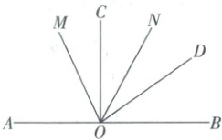 9.D【解析】设∠NOC=∠NOD=x,则$∠AOD=90^{\circ}+2x,$因为OM是∠AOD的平分线,所以$∠DOM=\frac{1}{2}∠AOD=45^{\circ}+x,∠COM=∠DOM-∠COD=45^{\circ}+x-2x=45^{\circ}-x.$所以$∠MON=∠COM+∠CON=45^{\circ}-x+x=45^{\circ}.$