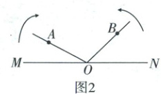 23. (11 分)如图 1, 点 $A$,$O$,$B$ 依次在直线 $MN$ 上, 现将射线 $OA$ 绕点 $O$ 沿顺时针方向以每秒 $4^{\circ}$ 的速度旋转, 同时射线 $OB$ 绕点 $O$ 沿逆时针方向以每秒 $6^{\circ}$ 的速度旋转, 直线 $MN$ 保持不动, 如图 2, 设旋转时间为 $t(0\leqslant t\leqslant 30$, 单位: 秒).