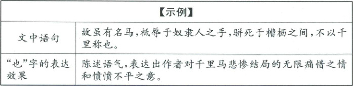 14. 虚词虽然很少有完整的意义,但在文中却具有表情达意的功能。请参考示例,结合语境,品味“安求其能千里也”中“也”字的表达效果。(2分)