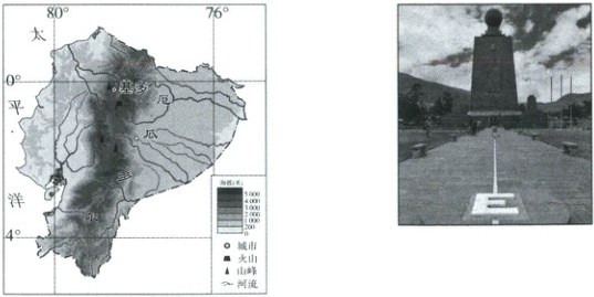 (湘教阅读改编)位于厄瓜多尔首都基多北部的赤道纪念碑被称为“世界之半”,碑体四周刻有E、S、O、N四个表示东、南、西、北的西班牙语首字母。读厄瓜多尔示意图和基多赤道纪念碑景观图,完成6~7题。