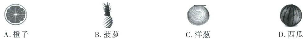 3.A 【解析】本题考查经线特点。从地球仪北极上空俯视经线,其分布状况与橙子的横切面最为相似;洋葱的横切面与从地球仪北极上空俯视纬线的分布状况最为相似;西瓜的表皮纹路与从侧面观察地球仪的经线分布状况最为相似;菠萝形状与地球仪不符。