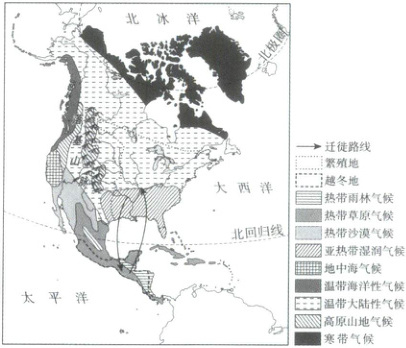 5.B【解析】本题考查导致红喉北蜂鸟每年进行迁徙的主要影响因素。红喉北蜂鸟每年迁徙是因为季节变化导致不同纬度地区气温、食物等条件不同。北美洲东部繁殖地夏季温暖,食物丰富,冬季时,繁殖地气温降低,食物减少,而中美洲地区纬度较低,冬季相对温暖,食物充足。因此影响红喉北蜂鸟每年进行迁徙的主要因素是纬度位置;海陆位置、地形地势、人类活动不是其迁徙的主要影响因素。