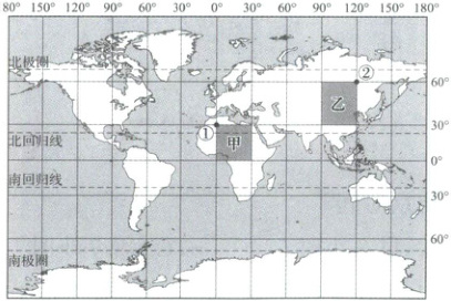 (5)根据所学可知,所有经线等长,纬线长度从赤道向南北两极递减。读图可知,甲区域和乙区域内经线的度数间隔和纬线的度数间隔一致,因此南北距离相等,东西距离从赤道向两极递减,甲区域较乙区域纬度更低,东西距离更长,实地面积更大。