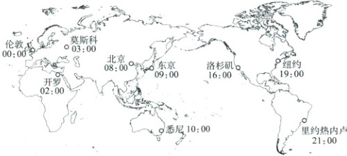 (山西真题改编)在伦敦留学的小董购买了一款电子手表,在设置时间时发现伦敦时间与北京时间存在差异,于是他查询了世界部分城市的电子时钟。读世界部分城市电子时钟示意图,完成4~5小题。
