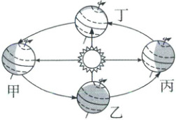6.D 【解析】本题考查地球在公转轨道位置的判读。读图并结合所学可知,以北半球为例,当地球运行到甲位置时,太阳直射北回归线,为夏至日(6月21日前后);当地球运行到丙位置时,太阳直射南回归线,为冬至日(12月22日前后);当地球运行到乙、丁位置时,太阳直射赤道,由于地球自西向东公转,因此乙为秋分日(9月23日前后),丁为春分日(3月21日前后)。2月11日距离春分日最近,此时地球邻近公转轨道的丁处。